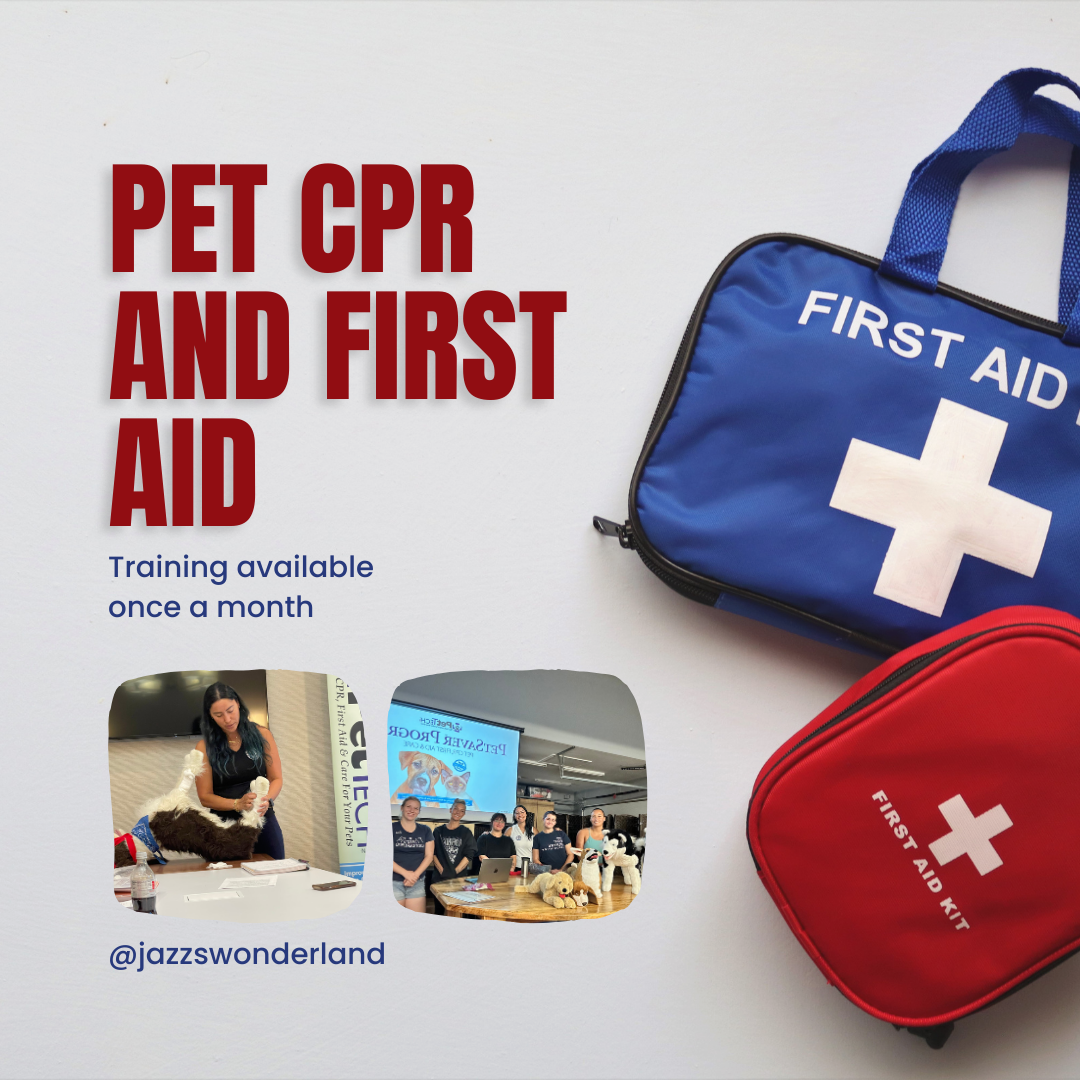 At Jazz’s Wonderland, we go beyond playtime and care — we prepare for the unexpected. Our owner is a certified Pet Tech CPR, First Aid & Care Instructor, which means:
